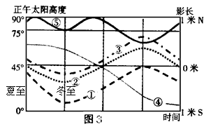 1.该地可能位于为2.图中①、②、③、④四条曲线中,能正确反映该地正午时物体影长周年变化是3.当该地日出时间达一年中最早时