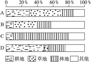 2、综合题 下图为中国、印度、日本、英国四国的土地资源构成图。读图,回答下列问题。