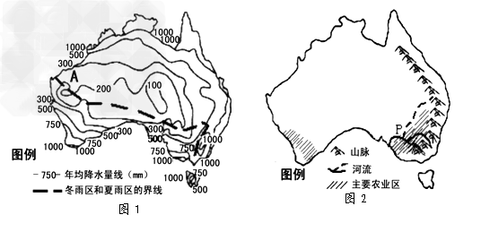 (2)澳大利亚大陆年降水量空间分布特点是________________,A地位于印度洋沿岸,试分析其降水较少的原因:_______________________________________________________。