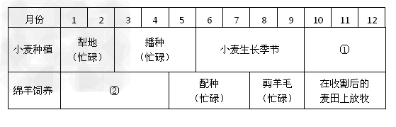1、综合题 下表表示澳大利亚小麦-牧羊农场的农事安排,读图1、图2,完成下列各题。