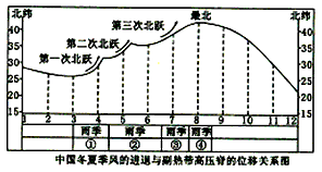 5、单选题 读“中国冬夏季风的进展的进退与副热带高压脊的位移关系图”,回答(1)——(2)题。