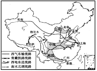 5、综合题 我国跨世纪的四大工程,在促进西部大开发、资源大调度等方面具有重大意义。读“我国四大工程示意图”,完成下列各题。