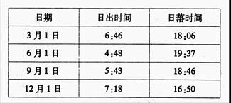 4、单选题  香水百合是一种长日照花卉,其开花期对日照时长非常敏感。在自然状态下,当日照时长长于14小时30分钟时香水百合才进入开花期,花期约3个月左右。下表为北京市不同日期的日出日落时间(北京时间)。据此完成下列各题。