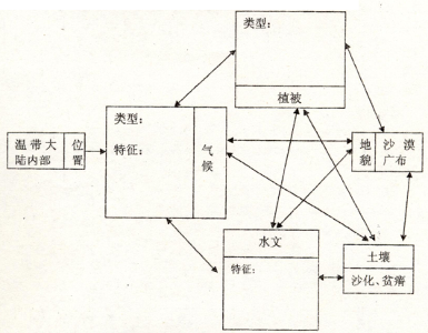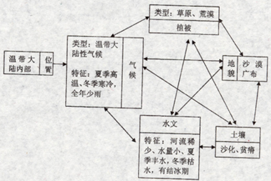 小题1:本区由于地处内陆,故气候类型:温带大陆性气候,特征:气候干旱,降水少,温差大;水文:河流少,以冰川融水为补给,河流流量少,流量的季节变化的(夏汛)。有冰期。植被:少,以草原、荒漠为主;土壤:沙质土壤;地貌:流水作用微弱,风力作用为主,沙丘广布。
