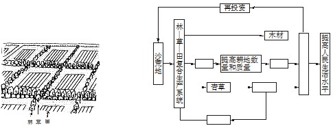 4、综合题 读“吉林省西部改造沙漠荒地的‘林—草—田’复合生态系统景观图”和“简化的系统框图”。该系统的目的是取得经济、社会、生态三方面效益的统一。读图回答下列问题。(11分)