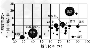 D.中国、美国应承担相同的减排责任?注:圆形大小反映的是各国二氧化碳排放总量
