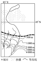 小题1:本题考查影响人口和聚落分布的主要因素。根据图中的经纬度判断,该地位于我国的西北内陆地区,气候干旱,降水稀少。所以制约图示区域城镇分布及城镇人口规模的主导因素是水源。所以本题选择D选项。