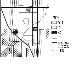 本题解析:本题考查城市功能分区和读图综合分析能力。(1)直接根据图示的图例判断,绿地在该市用地中面积最大;地租最高的应位于市中心,故判断为②;(2)图例③主要分布于城市的边缘,河流的下游,且靠近交通线,故判断为工业区。由于环境污染较严重,可能导致湖泊水污染严重。(3)绿地能起净化空气、增加蒸腾作用,故增加空气的湿度,调节温差的作用。(4)结合上题分析,该市的工业区分布于城市的东面和南面,故判断盛行风向可能为西北风或偏北风。