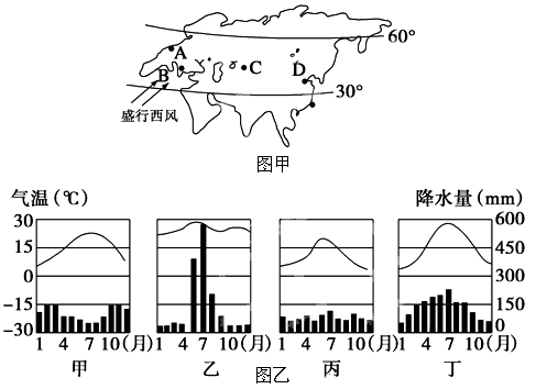 (1)由图上可知,A是位于欧洲西部,是温带海洋性气候,此气候区是位于南北纬40°-60°的大陆西岸,常年盛行西风,常年温和湿润,根据此气候特征可以判断与上图中的丙是相符合的.