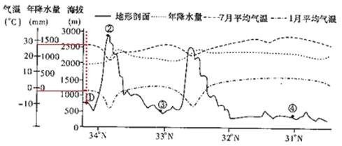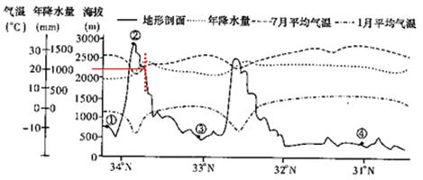 4、单选题 下图是“沿106.5°E经线的地形剖面及相关气候资料图”,据图完成下列问题。