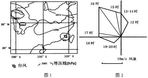 3、综合题 2010年10月下旬,我国东南沿海地区受到超强台风“鲇鱼”的袭击。图1为10月22日12时近地面等压线分布图,图2是该日沿海某测站测得的风向和风速分布图。读图并结合所学知识,完成(1)-(3)题。