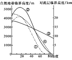 小题1:雪线(终年积雪下限)和林线(山地森林分布的最高界线)随纬度变化趋势相似,在副热带地区气温较高,雪线和林线分布的海拔略高;对流层高度低纬度约17-18千米,高纬度约8-9千米,③为对流层高度随纬度变化曲线。选项A正确。