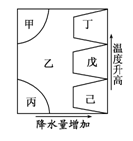 5、填空题 该图是植被类型与温度、降水量的关系示意图,图中植被类型分别为草原、苔原、荒漠、阔叶林、针叶林、热带雨林。读图完成41~42题。