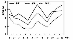 3、单选题 在风力较小、逆温、相对湿度较低的情况下,随着悬浮颗粒物的增多而导致能见度小于10千米的现象叫霾。右下图为北京、天津、河北三省市各月霾日数变化图,读图,完成下列小题。