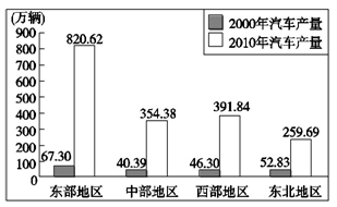 2、单选题 改革开放以来,中国汽车工业快速崛起,目前我国已成为全球最大的汽车生产国。同时自主品牌汽车开始走出国门,到巴西投资建厂。下图为我国各地区2000年和2010年汽车产量比较图。完成下列各题