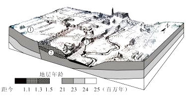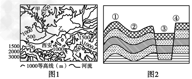 2.图2所示①~④四种地质构造中,最有可能形成乙地区地形类型的是