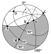 (2)弧KBC为晨昏圈,B点为晨线、昏线的分界点;根据图中地球自转方向判断:弧线BKA段为晨线,弧线BC段为昏线。