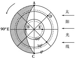 (3)A、D、E三点中,自转线速度最大的是 、太阳高度等于0°的是 、昼最长的是 。(3分)