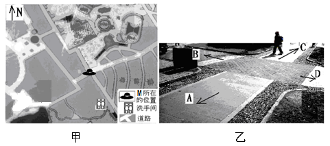 3、单选题 10月下旬一天上午,福州的M同学在市内一公园游玩,图甲为公园内十字路口附近的导游图,图乙为M同学当时拍摄于此路口的照片。读图回答下列题。