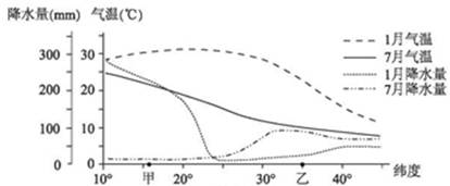 1.根据图例,该地1月平均气温高于7月,说明位于南半球,图中横轴代表的纬度为南纬,7月气温自北向南递减正确,选A;甲地1月降水量与7月降水量差值大于乙地,说明甲地降水量季节变化比乙地大;1月降水量随纬度升高而减少,应该是南少北多;甲地1月气温与7月气温差值比乙地小,说明甲地气温年较差比乙地小。