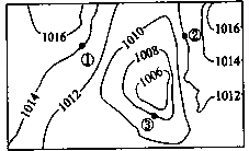 试题解析:根据三处的等压线,确定画北半球近地面的风向,先画水平气压梯度力,垂直于等压线,由高压指向低压,再画风向,向右偏一锐角。