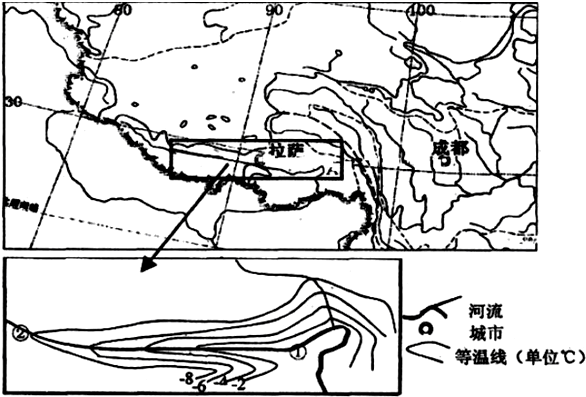 (2)图中等温线为区域 月(1月、7月)等温线分布状况。分析①②间等温线弯曲的成因。(4分)