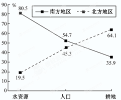 1、单选题 读我国南、北方水资源、人口及耕地分布对照图(下图)。回答下题。
