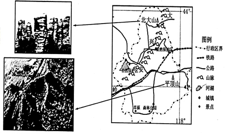 3、综合题 ( 10 分)【旅游地理】下图为我国某地区及相关景观示意图。该地在距今 l 万至 300 万年期间为冰雪覆盖,景观处岩层基本上由花岗岩组成。据此回答下列各题。