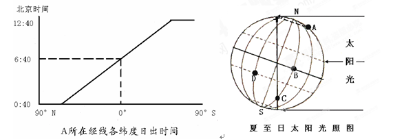 4、综合题 读夏至日太阳光照图和A点所在经线各纬度日出时间图,回答下列各题。