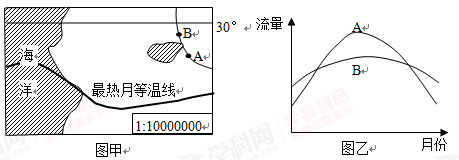 3、单选题 甲图中的陆地地势较为平坦,乙图中河流的年径流量曲线是从甲图中A、B两处测得的。读图完成下列小题。