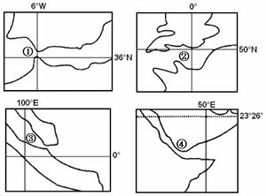 1.由经纬网与轮廓可判断①为直布罗海峡,②英吉利海峡,③为马六甲海峡,④为曼德海峡。由香港到鹿特丹港最近的肯定是③④①②。