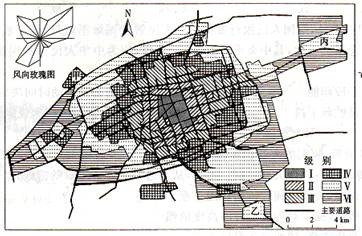 1、单选题 下图为呼和浩特市居住用地分级状况图(按地价Ⅰ为最高级,Ⅵ为最低级)。读图.回答下列问题。