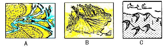 (2) 判断以上各种地貌的主要成因:A主要是因____________形成的;B主要是因__________形成的;C主要是因__________形成的。(6分)