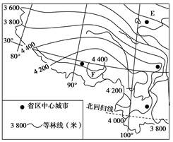 【小题3】图示东部地区为我国的横断山区,山脉南北走向,海拔较低,受地形影响林线也呈南北走向,海拔较低。选B正确。