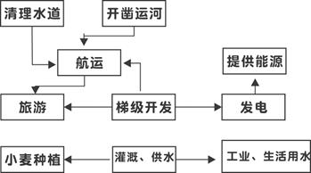 (2)(10分)发电,为经济发展提供能源(2分);航运,为经济发展提供良好的运输条件(2分);?供水,水库蓄水为经济发展提供用水(2分);旅游,促进以旅游为主的经济发展(2分);养殖,利用文库、河道发展水产养殖(2分)。(为工业发展提供能源、良好运输条件和工业用水等。)