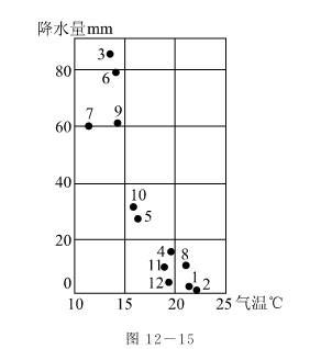 2、单选题 读气候资料,图12-15中点位的标号代表月份,回答1-2题。