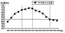 3、单选题 如图为中国劳动适龄人口(15~64岁)比重预测图。读图,回答问题: