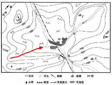 点评:本题难度较大,解答本题的关键是掌握等高线地形图的判读技巧,明确河流流向、水库选址、陡崖计算等问题的判断。另外本题还可考查甲处成为该区域中心城市的区位条件,甲处成为该区域中心城市主要跟地形:河谷地带,地势平坦开阔;水运:处在河流交汇处,水运发达;水源:有河流,水源充足。