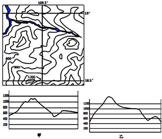 【小题1】由图中等高线数值变化可知等高距为200m,最高处的海拔高度大于1400m小于1600m,所以该地区以丘陵山地为主;图中等高线比较密集,说明地形起伏大,地势崎岖,河流水流湍急;由该地区所处纬度可知,位于热带地区,终年高温;由图中经纬度可知,该地位于海南岛,属于热带季风气候,夏季盛行偏南风,冬季盛行偏北风,故选项A正确。