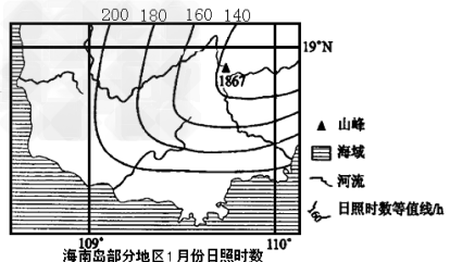 1、综合题 下图所示我国“海南岛部分地区1月份日照时数分布图”,根据要求回答问题。