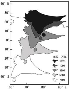 小题2:本题考查地理图表的判读能力。根据图示:该半岛由距今7100万年至距今1000万年间向北移动的经度大约为40°,则距离约为4440km。所以本题选择C选项。