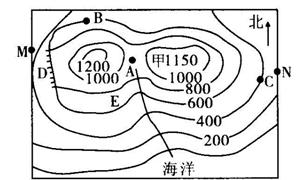 (6)在下图中作沿MN的地形剖面图。(2分)