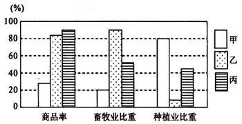 3、单选题 读“甲、乙、丙三地农业商品率、畜牧业比重、种植业比重图”,完成下列各题。