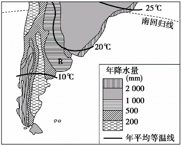 1、综合题 读“南美洲南部降水分布与气温曲线图”,完成下列问题。