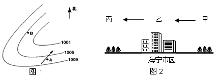(2)图2为图1所示的锋面经过海宁的大体过程,移动方向为从甲到丙。当锋面位于乙处时,市区往往出
