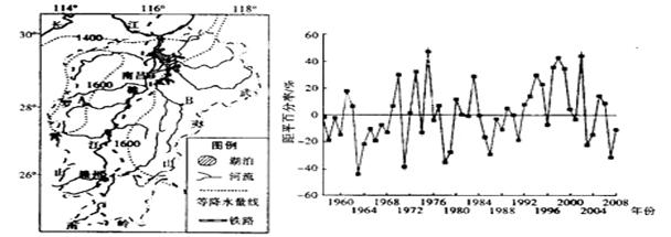 (1)根据右图分析,江西省降水年际变化大。江西省是亚热带季风气候,当夏季风强年份,由此产生的锋面雨带移动速度快,在江西省停留时间短,雨季短,导致降水少。当夏季风弱的年份,由此产生的锋面雨带移动速度慢,在江西省停留时间长,雨季长,导致降水多。所以降水年际变化大与夏季风强弱关系密切。