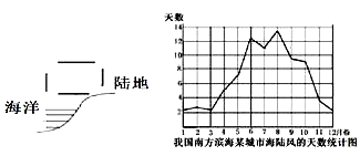 (2)从右图中一年中海陆风的统计天数曲线变化可知,一年中海陆风出现的天数最少的季节是冬季,每月只有2天左右;主要是因为该季节冬季风(或者偏北风、西北风、东北风)势力强盛,“掩盖”了海陆风。
