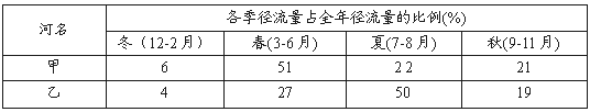 (2)甲河流春季径流量大(以春汛为主)(2分);冬季积雪多,春季气温升高,融雪补给量大(2分);乙河流夏季河流径流量大(以夏汛为主)(2分);