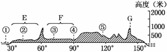 1、单选题 下图为沿60°纬线所作的地形剖面图,读后完成12一13题。