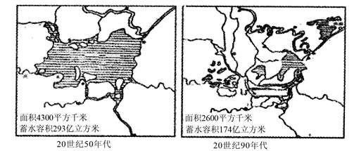 3、单选题 下图为20世纪50年代到90年代洞庭湖的变化图,读图完成下列小题。